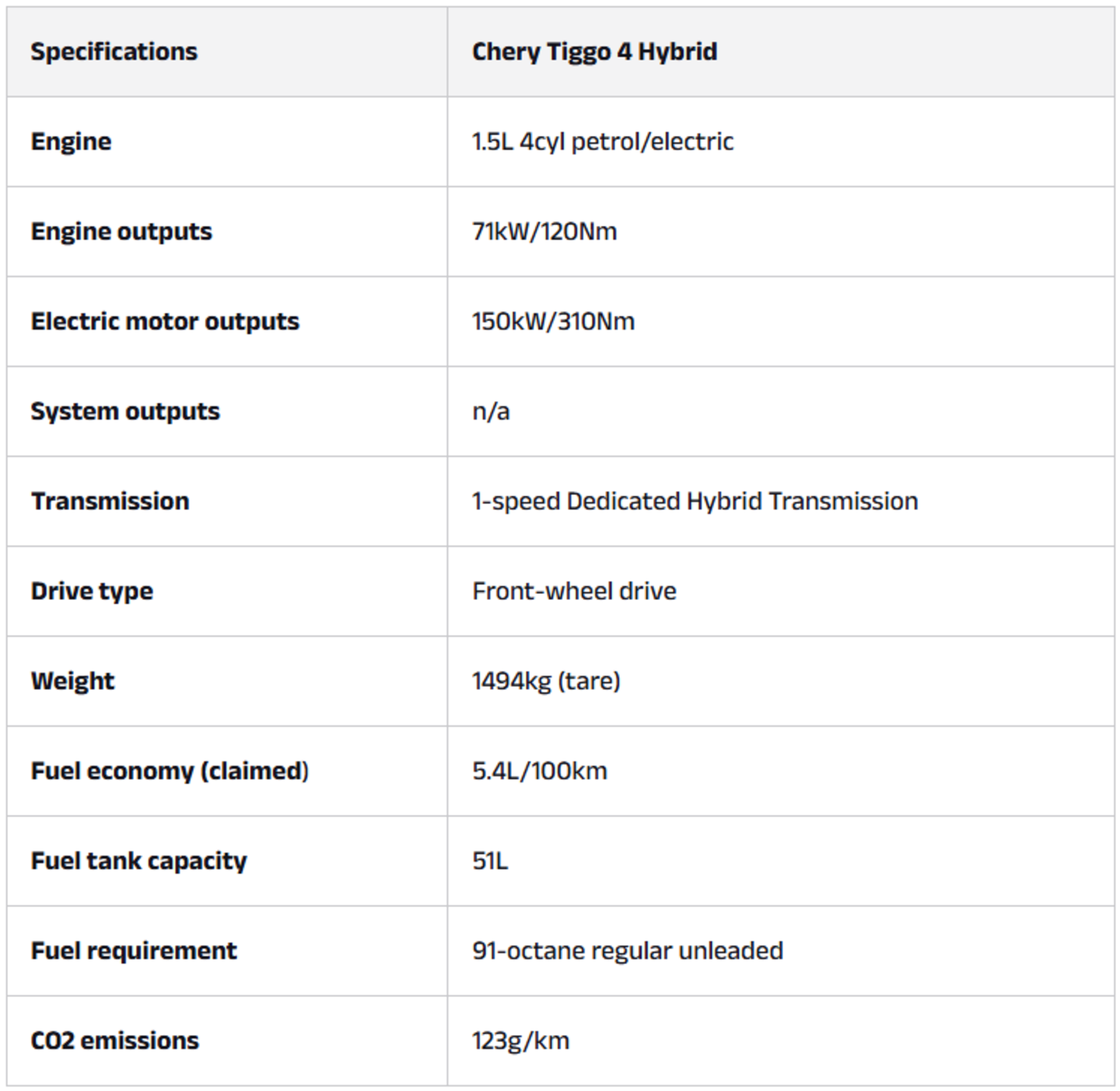 While the petrol-powered Chery Tiggo 4 range has a five-star safety rating from ANCAP, based on testing conducted in 2023, this hasn’t yet been extended to the hybrid model.